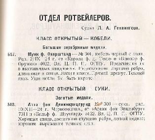 | Дата проведения | Статус | Название | Эксперт | Класс | Результат | Число собак в классе | Число собак на выставке (того же пола/всего) | | 14.05.1927 | всероссийская | 3-я Всероссийская выставка собак (Москва) -Россия- | Л.А.Геннингсон | класс открытый | 001,