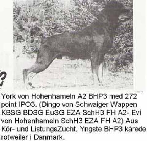 РОДОСЛОВНАЯ |  | | Инбридинг: Dina vom Kaiserberg: 3:4; Dack von der Meierei: 4:4; |  | IPO - 3, SchH/VPG - 3 York von Hohenhameln [P] ADRK 063191 / DKK 18714/84, HD-A Ole Strom Lagrelius, 1984 |