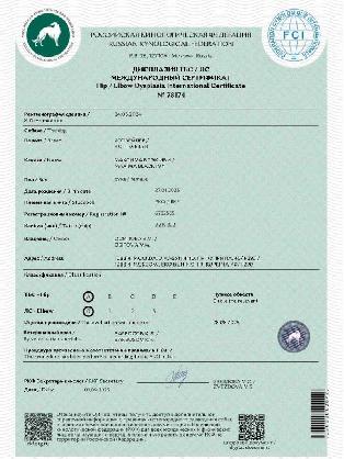 | Titles: | | J.Rus.Ch, J.RKF.Ch | | Certificates: | | 1 x BIS.J-III, 1 x BIG-III | | Working cert. and tests: | | ОКД - 1, T - 1, JLPP N/N, Coat length S/S |