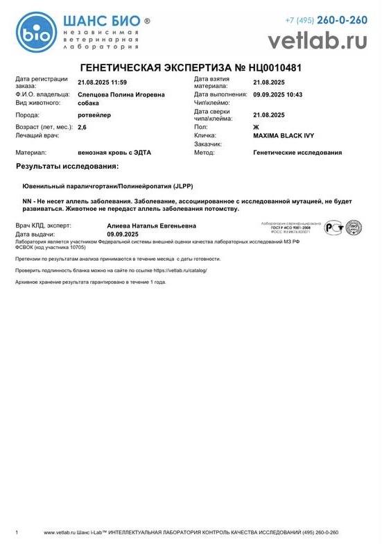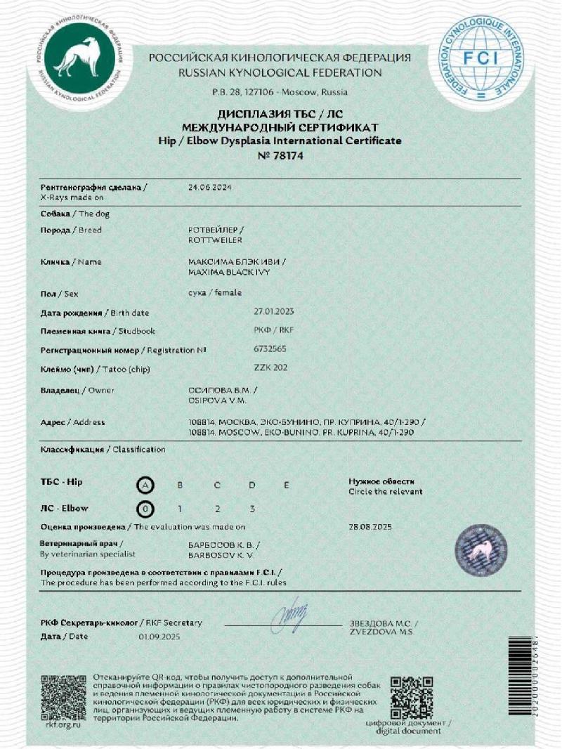 PEDIGREE |  |  | J.Rus.Ch, J.RKF.Ch ОКД - 1, T - 1, JLPP N/N, Coat length S/S Maxima Black Ivy [P] , HD-A/A, ED-0/0 Осипова В. , 2023 |