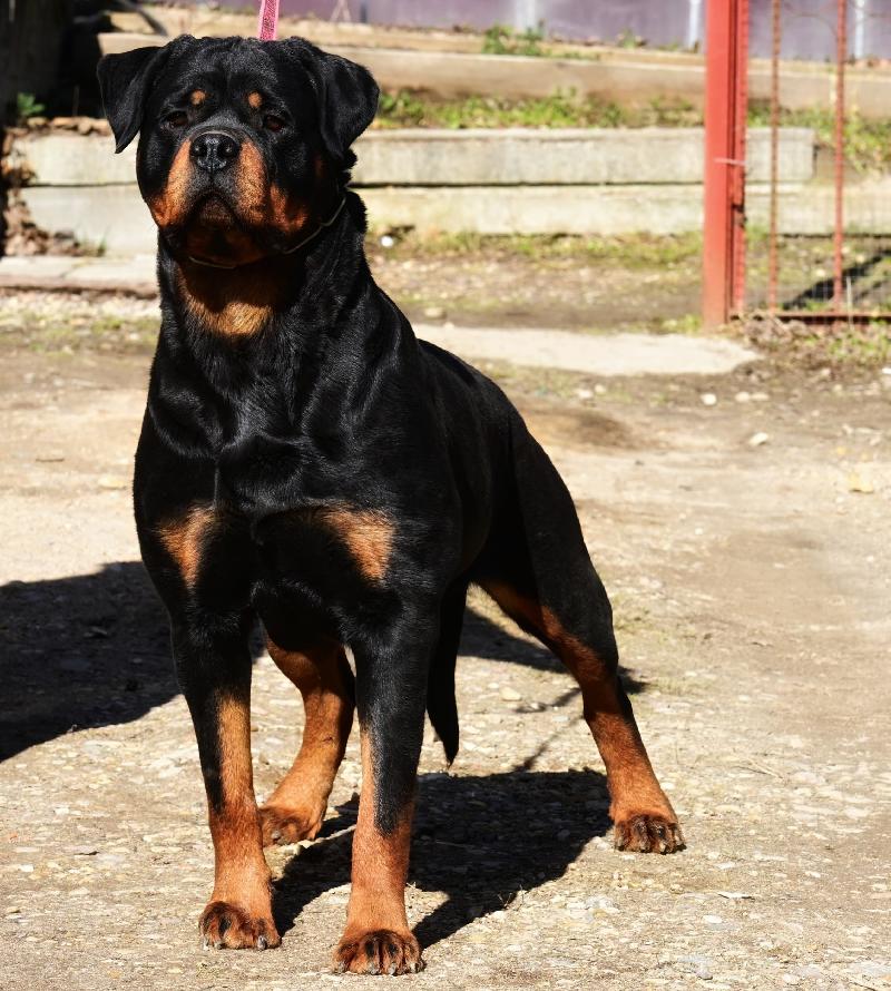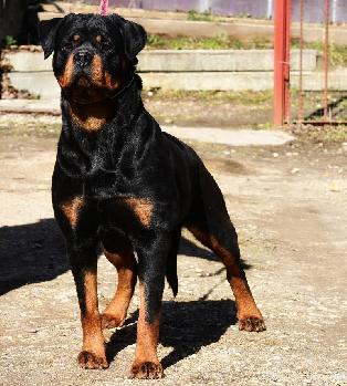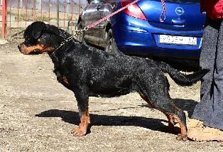 2 года, красивая породная голова. Среднего размера, правильно посажены уши, хороший стоп, широкая, короткая морда, темные глаза, темный пигмент дёсен, сухая крепкая шея, оч хорош плечи, хороший костяк, хорошие линии вверха и низа, хорошего объема, хорошие углу задних конечностей, хорошо развита мускулатура, яркий подпал, четкие границы, свободные движения.