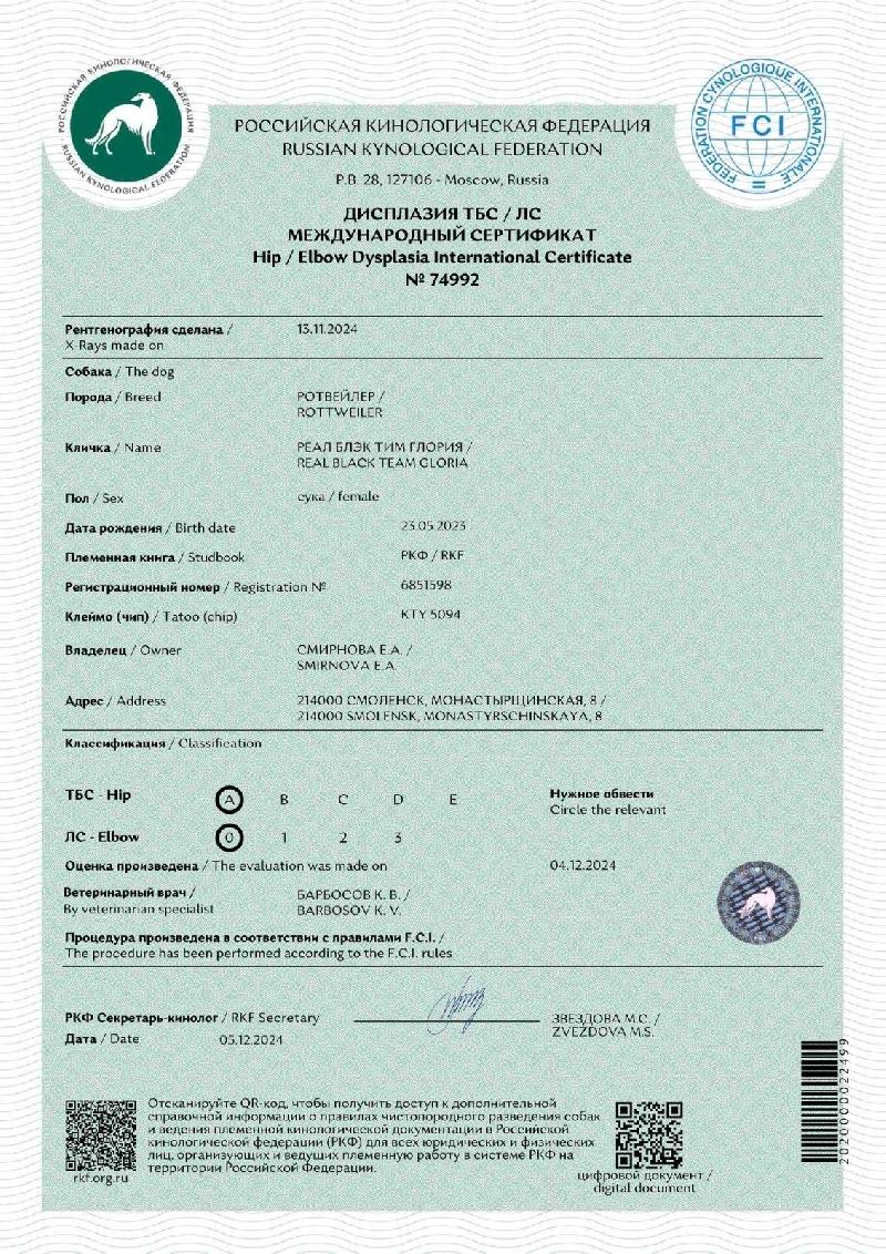 Blr.Ch, Rus.Ch, J.Rus.Ch ОКД - 3 Роттхарбург Южная Дакота [P] РКФ 5589953, HD-A, ED-0 Кравцова Е., 2019 |