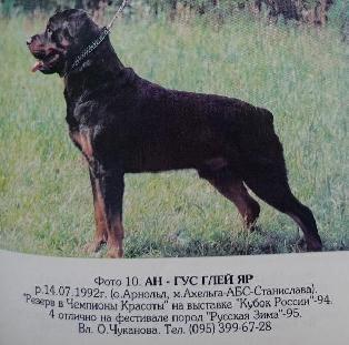 РОДОСЛОВНАЯ |  | | Инбридинг: Harras vom Steinkopf: 4:2; |  | АН-ГУС ГЛЕЙ ЯР [P] РКФ 27068, О.Чуканова, 1992 |