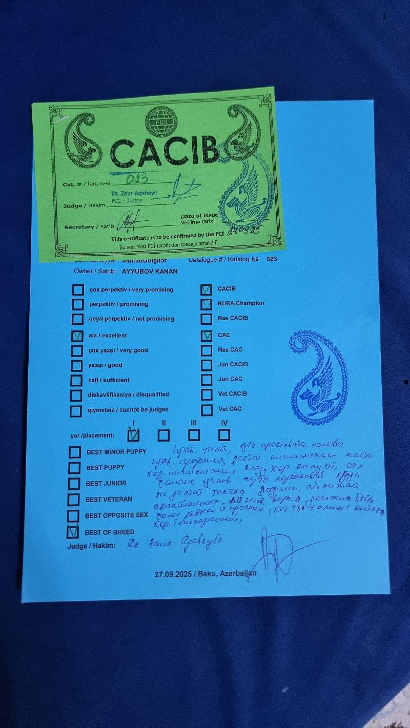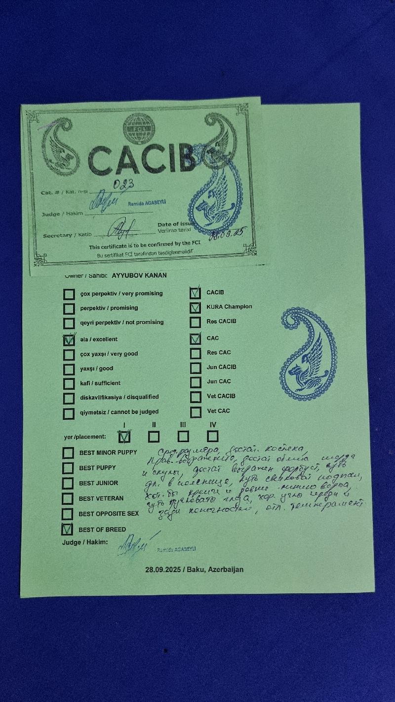 | Сертификаты: | | 1 x BIG-III, 4 x CACIB, 4 x CAC, 2 x BOB, 2 x Лучшая сука |
